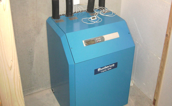 Sofern deren Leistung nicht ausreicht wird über eine vollautomatische, wohnraumintegrierte Holz-Pellet-Zentralheizung die obere Hälfte des Speichers nachgeheizt.
