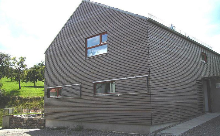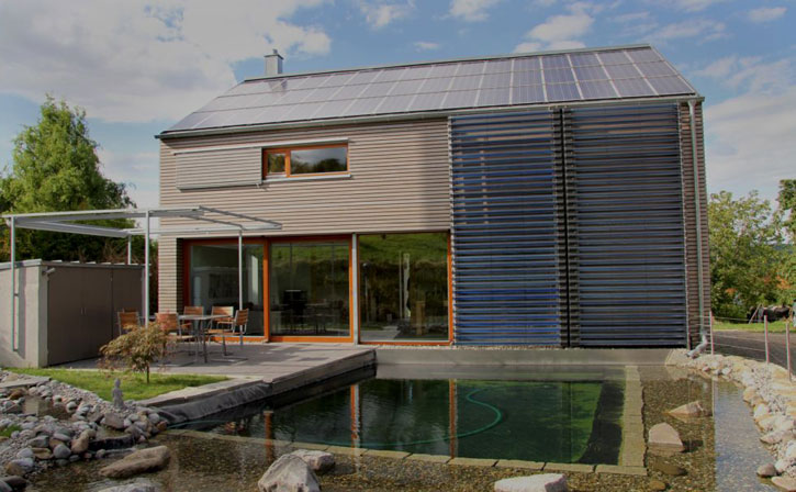 Die Dachfläche des Sonnenhauses ist nach Süden ausgerichtet. Eine Indach-Photovoltaikanlage mit einer Leistung von 6,4 KWpeak bildet die Süddachfläche des Sonnenhauses.